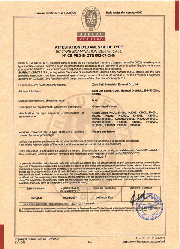 淄博太極在中國搪玻璃設備制造行業(yè)中首家通過ISO90001質(zhì)量體系認證,并擁有美國ASME認證、歐洲PED認證以及國家部門頒發(fā)的搪玻璃制造許可證、進出口許可證和百余項榮譽證以及三十六項專利等。